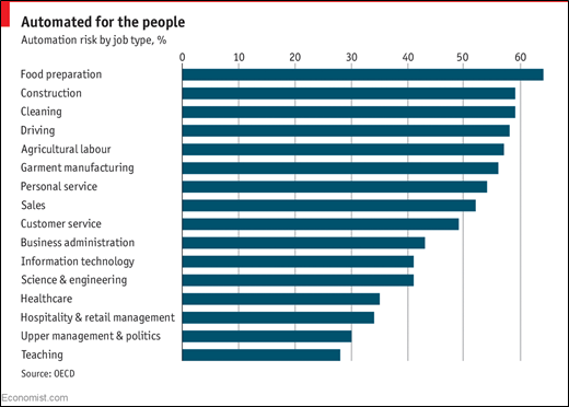 An article in the Economist plotted this graph showing the risk of automation by job category across the OECD: